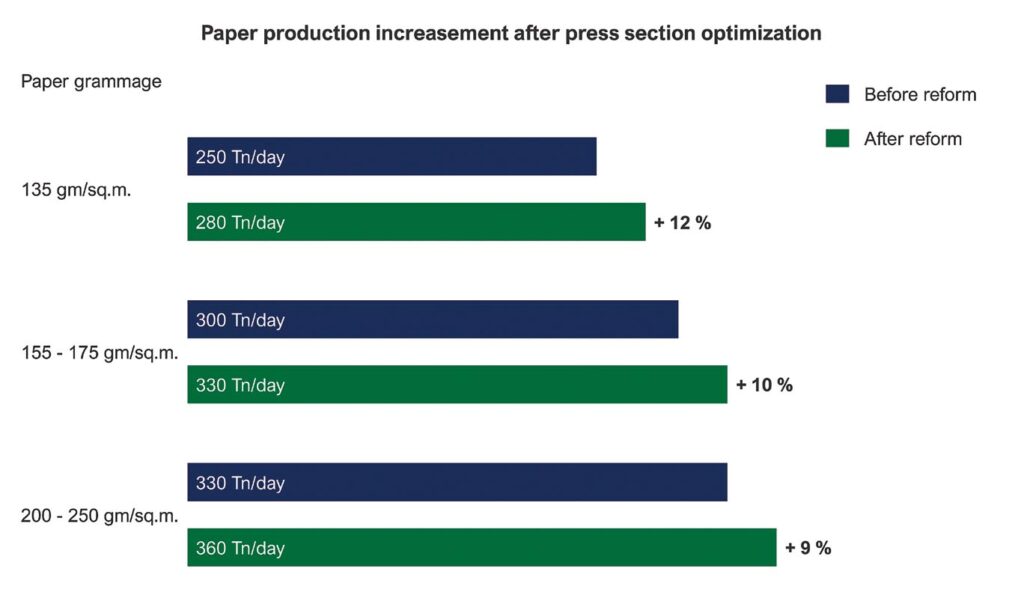 - Paper production at Cartopel Cuenca PM1: 135 gm/sq.m: Before project 250 Tn/day – After project 280 Tn/day (increasement + 12%). 155-175 gm/sq.m: Before project 300 Tn/day – After project 330 Tn/day (increasement + 10%). 200-250 gm/ sq.m: Before project 330 Tn/day – After project 360 Tn/day (increasement + 9%).